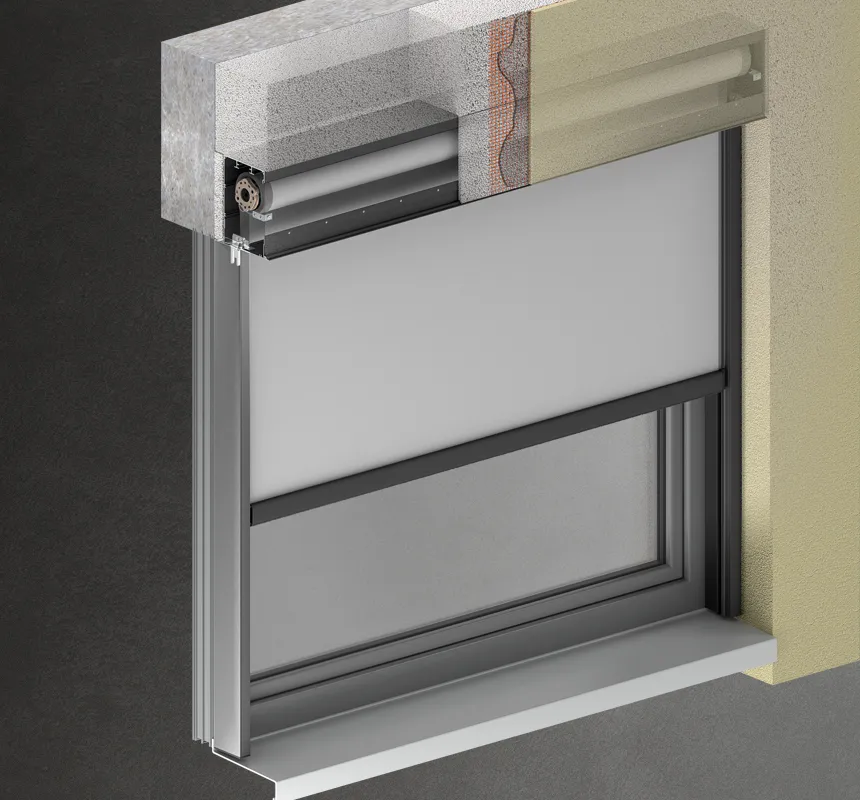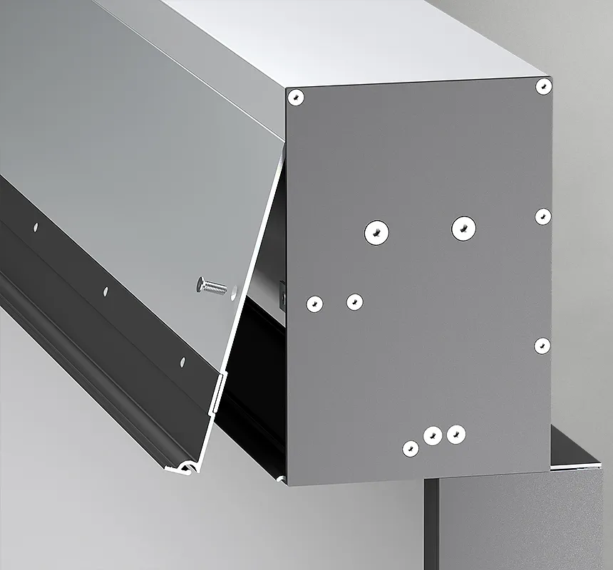 Podomítková kazeta je vyrobena z extrudovaného hliníku a kontrolní kryty umístěné ve spodní části kazety umožňují snadný přístup k motoru za účelem údržby. V závislosti na místě použití a typu zástavby lze vybírat ze 2 typů kazet pro podomítkovou montáž.