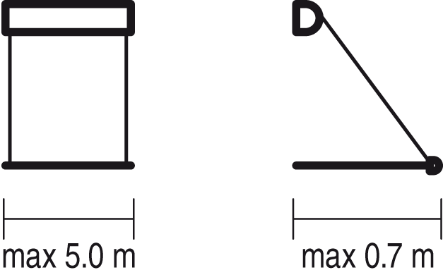 Sie werden mit Haken am Ausladeprofil befestigt und der Neigungswinkel des Tuchs wird durch Verstellen der Armposition verändert. Die Tuchspannung wird manuell eingestellt, indem einer Kurbel der Öffnungsgrad der Markise eingestellt wird. Die schräge Tuchstellung schließt den Raum optisch nicht ab, bietet aber nicht nur Sonnenschutz für den Balkon selbst, sondern auch für den angrenzenden Raum.