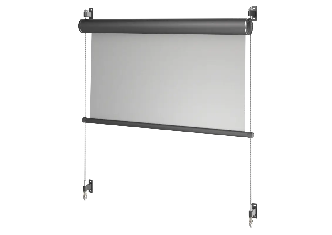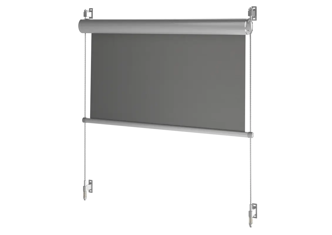 Zentrales Element der gesamten Konstruktion sind Stahlseile, die an der Wand befestigt das System und die Kassette halten und als Führung dienen.