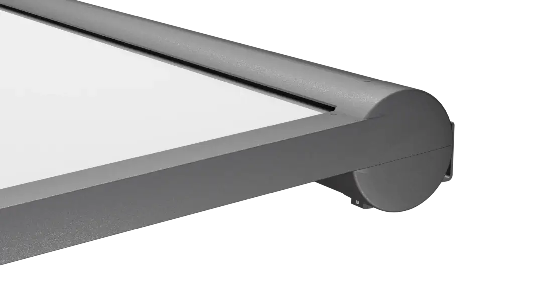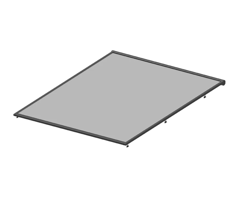 Die Konstruktion mit beweglichem Dach besteht aus Elementen aus stranggepresstem Aluminium und Edelstahl. Der Stoff auf dem Wickelrohr wird über einen Gurt, der in einem Rollenspannsystem geführt wird, ein- und ausgefahren und elektrisch angetrieben. Das System ermöglicht eine modulare Montage.