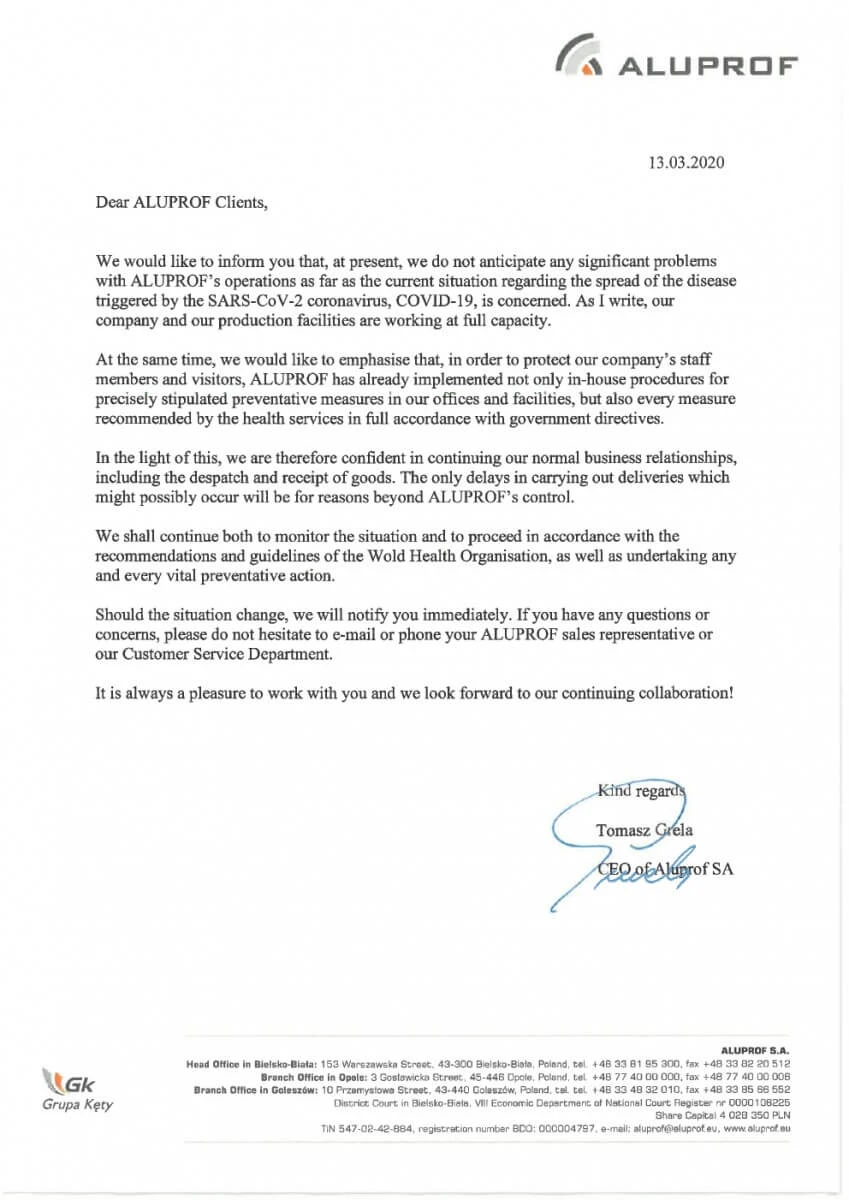 We have posted a letter from the CEO of the ALUPROF Management Board. It concerns the company’s operations during the current situation with the coronavirus (COVID-19) and you’ll find it below this announcement, in the GALLERY section.