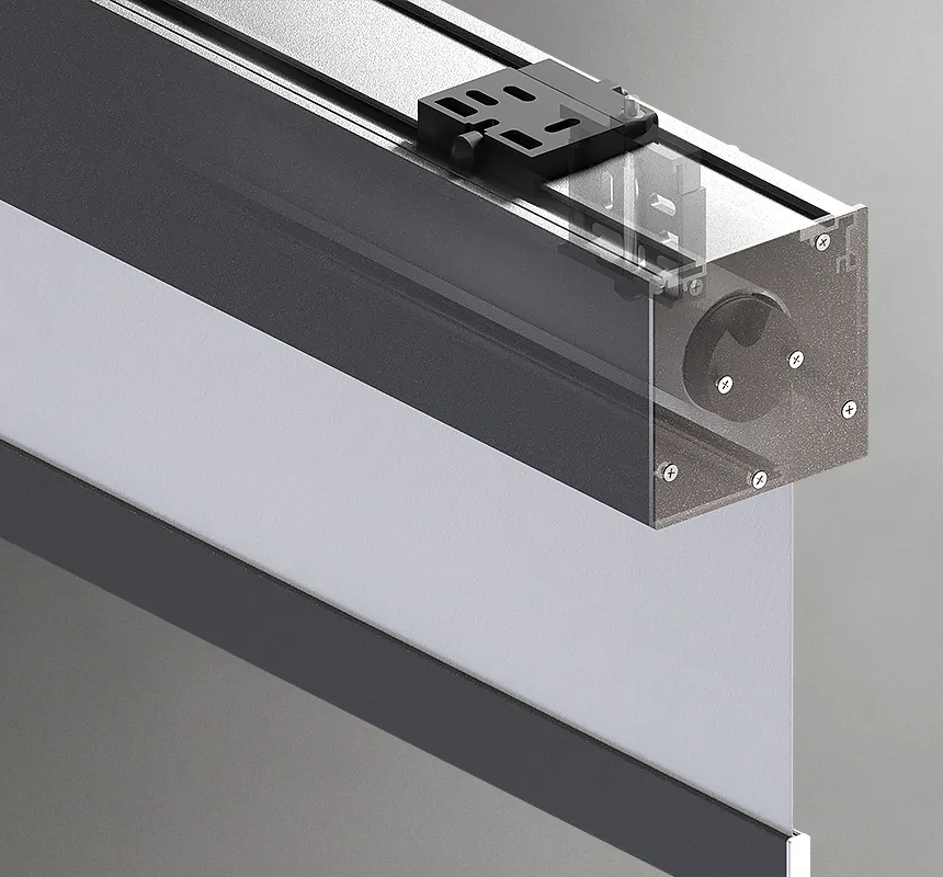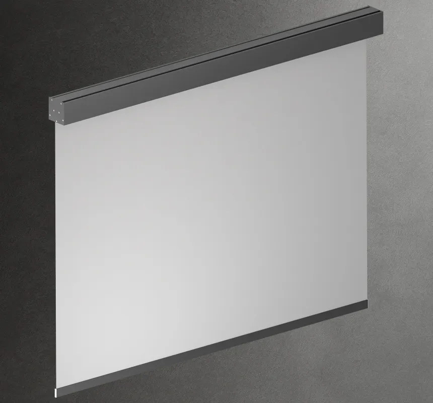 The fabric is rolled up to a square cassette which is also the element that holds the system on the wall.