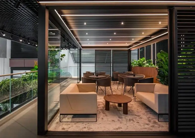 Na efektownym, dwupoziomowym stoisku o powierzchni ponad 200 m2, Aluprof oraz SELT zaprezentowali nowości produktowe oraz cenione rozwiązania o doskonałych parametrach i nowoczesnym designie, doskonale wpisujące się w tematykę tegorocznych targów, czyli ekologię i zrównoważony rozwój. Odwiedzający mogli zobaczyć m.in. wielkogabarytowe drzwi przesuwne MB-SKYLINE TYPE S (10m x 3,5m), drzwi tarasowe MB-82HS (6m x 2,3m), fasadę MB-SR50N z systemem RUR czy drzwi zewnętrzne MB-86N PIVOT DOOR. Piętro zdobiła pergola tarasowa MB-OpenSky 140 z zabudową całoszklaną MB-OpenSlide, screenami SkyRoll oraz produktami SELT - markizą Corsica Awning i Systemem SLIDE.