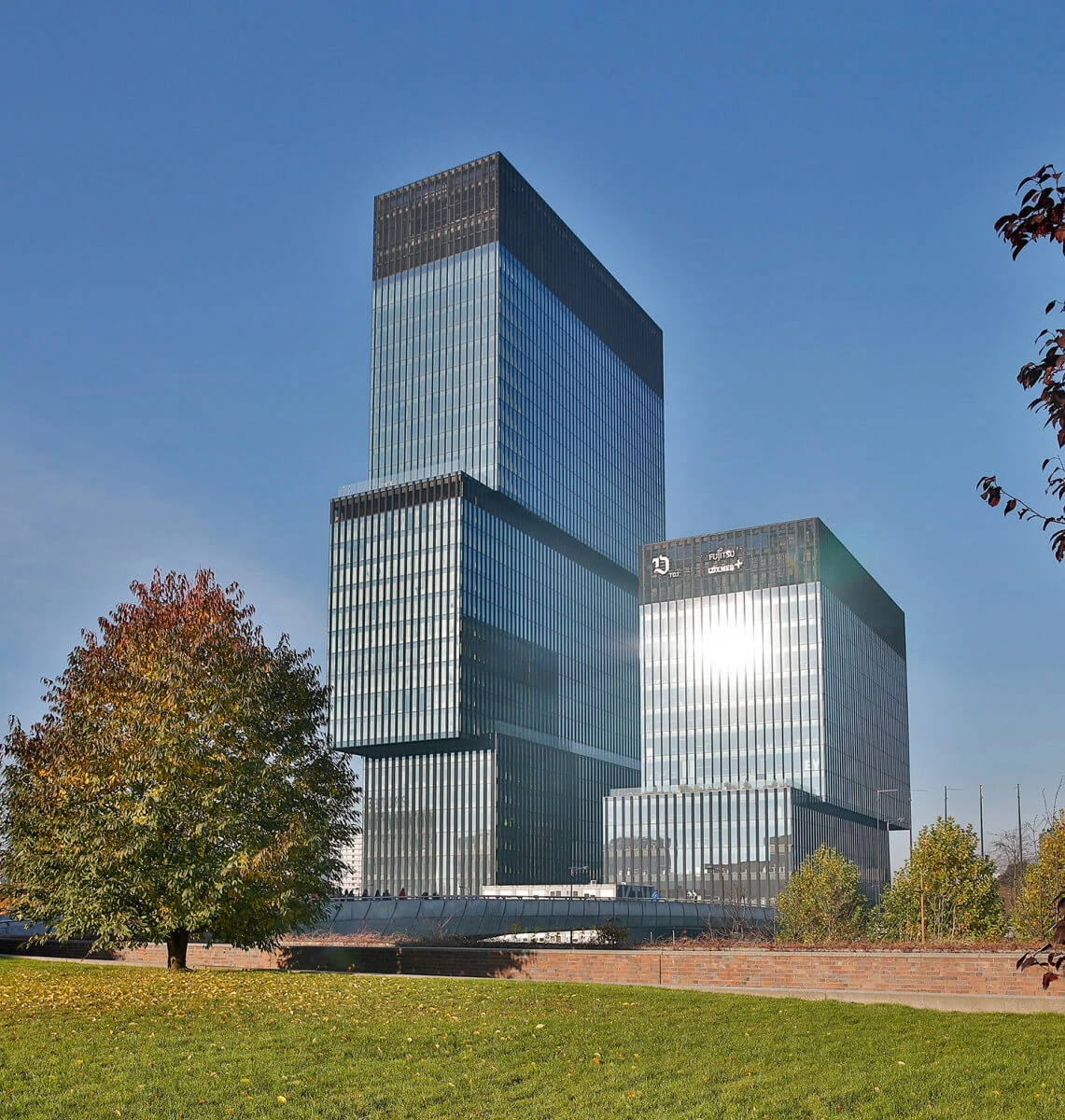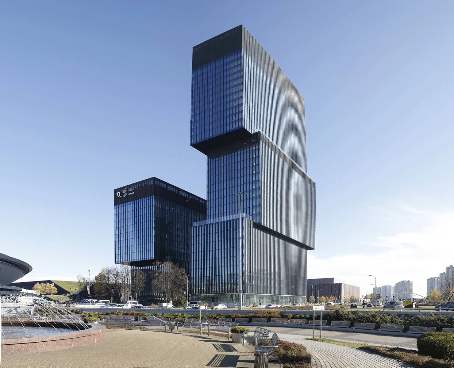 Oprócz dynamicznej bryły, a właściwie kompozycji dwóch dynamicznie korespondujących ze sobą wież, uwagę przykuwa wyjątkowa fasada szklana zaprojektowana z udziałem zaawansowanych systemów aluminiowych marki Aluprof. To efekt współpracy projektantów z Medusa Group oraz inżynierów Aluprof: fasada segmentowa, która pozwala na budowę imponujących przeszkleń, a także przenoszenie ponadnormatywnych obciążeń. Na potrzeby tej inwestycji zaprojektowano specjalny system aluminiowy – fasadę elementową MB-SE85.KTW. W obiekcie wykorzystano także fasadę słupowo-ryglową MB-SR60N EFEKT oraz drzwi MB-86SI wpinane w fasadę elementową i fasadę słupowo-ryglową.