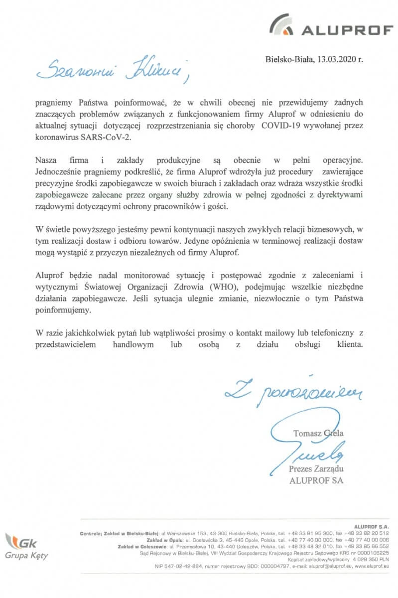 List prezesa zarządu Aluprof w sprawie funkcjonowania firmy w sytuacji zagrożenia koronawirusem (COVID-19)