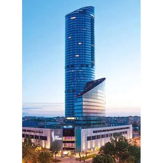 The structure of Sky Tower is based on two high rise buildings – a 212 m in height main tower, connected to the second building, by way of a cascade sloping design, from 92 m down to 68 m. Both buildings are seated on a “podium” designed base, which functions as a spacious retail and shopping centre.