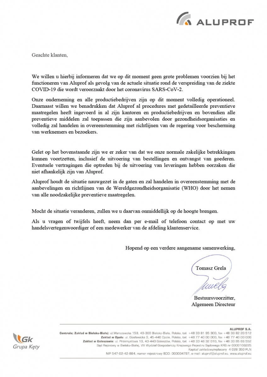 Brief van de CEO van het algemeen Aluprof bestuur in verband met de bedrijfsactiviteiten gedurende de coronavirus (COVID-19) crisis