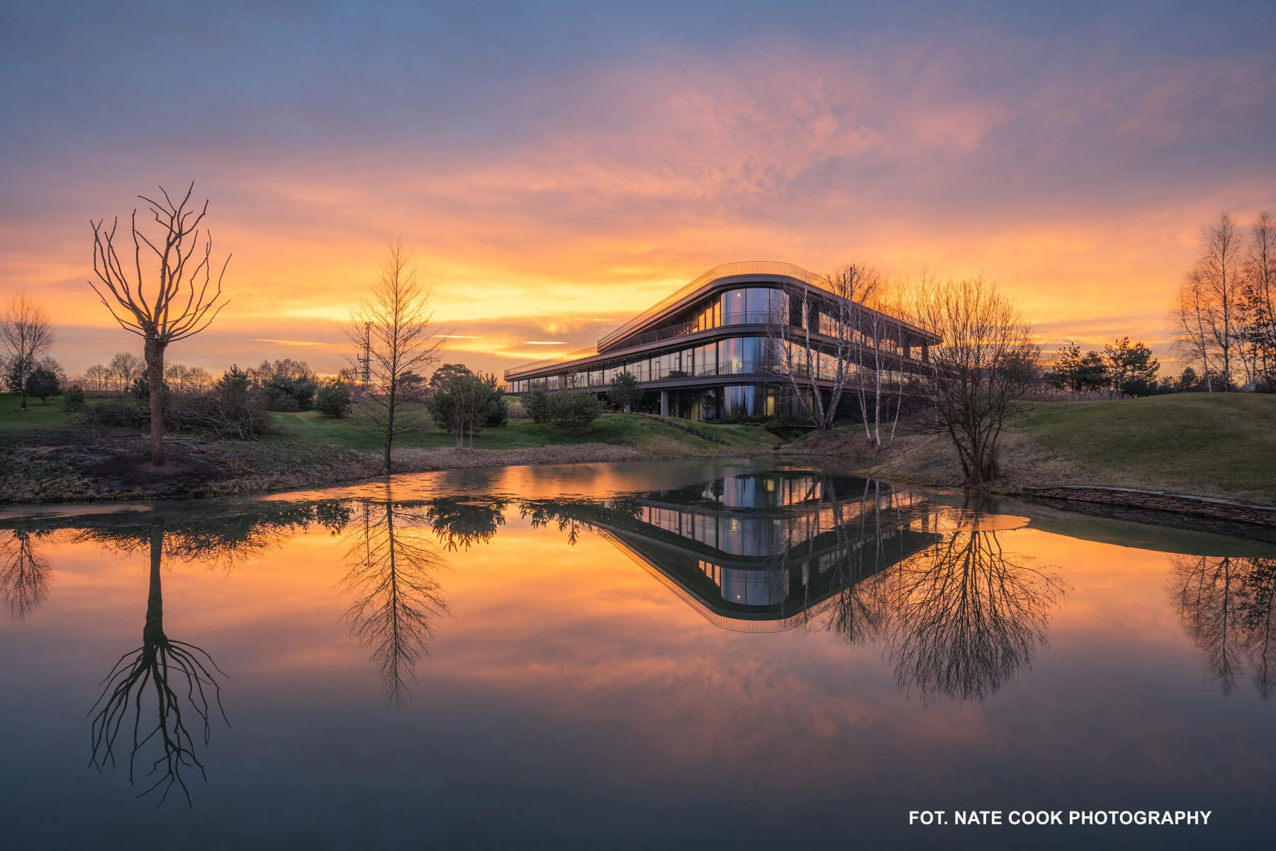 Het nieuwe kantoorgebouw van Press Glass Polska – Europees marktleider op het gebied van dubbel glas – staat op een ongewone plaats voor moderne commerciële klasse A-gebouwen. Het bevindt zich namelijk enkele kilometers van de stedelijke bebouwing, tussen eindeloze groene landerijen, meren en beken, bosjes en uitgestrekte golfbanen. De investeerder had een moderne werkplek voor ogen waar werknemers voortdurend in contact staan met de natuur.