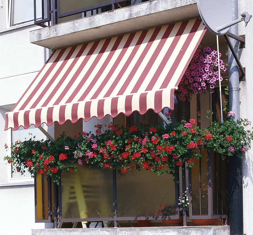 Charakterystyczne ramiona tej markizy montowane są bezpośrednio do balustrady balkonu i umożliwiają prostą regulację kąta nachylenia tkaniny.