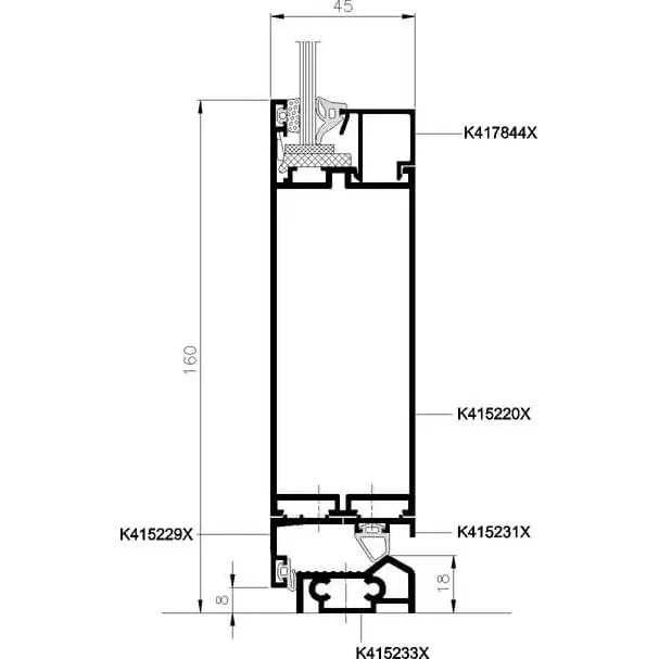 Конструктивная глубина оконных профилей составляет: 45 мм (коробка), 54 мм (створка), а дверных – соответственно: 45 мм и 45 мм. Так принятые глубины профилей коробки и створки, дают эффект одной плоскости с наружной стороны после закрытия – касается окон, и эффект одноликой поверхности дверного полотна и коробки – касается дверей. Форма профилей позволяет получить тонкие и прочные конструкции окон и дверей.